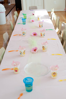 I borrowed two tables from our church nursery, along with little chairs for the little ones to sit at. There was enough room that mom's or dad's could sit with them. Each guest was also given a sippy cup with apple juice in it, which they took home.